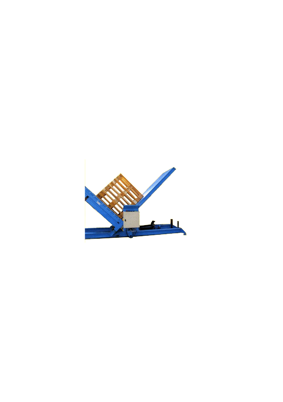 En position basculée, l'opérateur peut contrôler l'aspect du dessus de la palette, puis en la déposant ( sans la soulever ) sur un train de rouleaux, il peut contrôler la face inférieure.